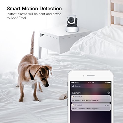 -. Feature : 【Reliable Secure Technology】 Secure your home and stuff you cherish even when you are far away. Perfect choice for home/office security, baby/pat care. Support WPA2-encrypted wireless network. Secure your personal recording information as it travels to your router. Remote monitoring technology based on three servers with https communications protocol. Ensure information between user and site/server cannot be read or forged by any third party. / 【Quick & Easy Installation】IP camera supports network cable or wireless installation. Quick respond code helps you get the operation App -- EyeCloud and add camera promptly. Voice prompts and clear instruction show you how to set it up. Compatible with: IOS/Android, Mac OS/ Windows, 2.4G Wi-Fi brand. / 【Clear Image & Two-Way Audio】 720P bright HD image in daytime. Record clear black and white image even in total darkness with 12 IR Leds. Night vision up to 32 feet. Never miss a moment, day or night. You can also talk and listen to your family or friend on mobile device and IP camera at anywhere, anytime. Support micro SD card up to 128G. Store every recording information. / 【Smart Monitor】Wide angle with 355°pan and 85°tilt. Monitor every corner of your home. Swipe right/left and scroll up /down on device screen to see different views. You can customized five most used sights as preset positions. The auto horizontal, vertical and preset cruise gives you hands - free experience. / 【Motion Detection】Advanced motion sensing technology. Alarm message will be sent to your mobile device upon detecting activity, click to get short video of detected motion. Adjustable low/middle/high detection sensitivity and 24 hours/7 days detecting schedule.