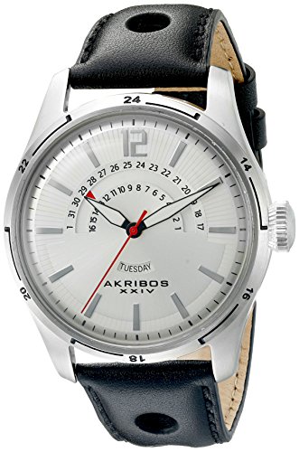 -. Binding : Watch -. Brand : Akribos XXIV -. Color : Black/Silver -. Department : mens -. EAN : 0848572071338 -. Feature : Silver radiant sunburst dial with three hand movement featuring date retrograde at 12 o'clock and day display window at 6 o'clock / Individually hand applied silver tone Arabic numerals and stick index with luminescent filled silver tone sword style hour and minute hands / Brushed stainless steel case with genuine black leather strap / Quartz movement with analog display / Water-resistant to 50 M (165 feet) -. Label : TWI Watches, LLC -. Manufacturer : TWI Watches, LLC -. Model : AK850SS -. MPN : AK850SS -. PartNumber : AK850SS -. ProductGroup : Watch -. ProductTypeName : WATCH -. Publisher : TWI Watches, LLC -. Studio : TWI Watches, LLC -. Title : Akribos XXIV Men's AK850SS Round Silver Dial Three Hand Quartz Staniless Steel Strap Watch -. UPC : 848572071338