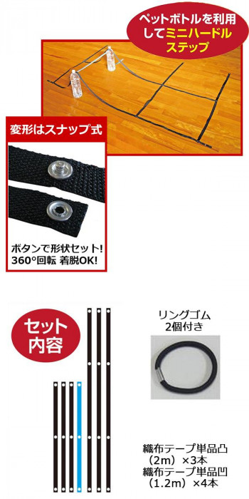 | スナップボタンによる連結方式なので、つなぐ場所をアレンジすれば様々な形状が作れます。お手持ちのペットボトルを使用してミニハードルにもできるので、トレーニングの幅が更に広がります。 |