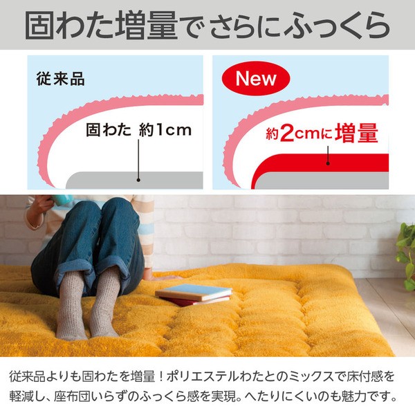 固わたとポリエステルわたとのMIXで、座布団いらずのあったか&もっちりした座り心地に。