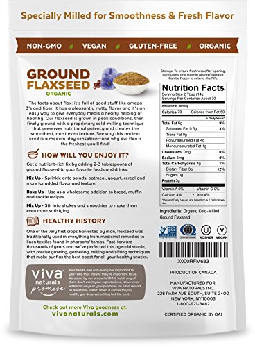 -. Feature : BOOST HEART HEALTH - Viva Naturals uses a proP.R.Ietary cold-milling method that protects omega-3's from the effects of oxidation, supporting a healthy heart and promoting greater cardiovascular benefits. / IMPROVE GUT HEALTH NATURALLY - Our flax seeds are finely ground to the softest grade for a higher fiber content and smooth consistency. Each serving provides 3g of dietary fiber for optimal digestive health and regularity. / FEEL FULLER LONGER - A combination of fiber and protein helps keep you satisfied all day long by curbing hunger and cravings. Each serving of Viva Naturals' flaxseed provides 3g of vegan protein, making it suitable for all diets! / VERSATILE KITCHEN STAPLE - Our flaxseed adds a pleasant nutty flavor to foods while boosting everyday nutrition. Blends seamlessly in cereals, desserts, smoothies and more. / Certified organic and non-GMO, Viva Naturals Organic Ground Flaxseed is allergen friendly and is sourced from select Canadian farmers for the finest quality guaranteed!
