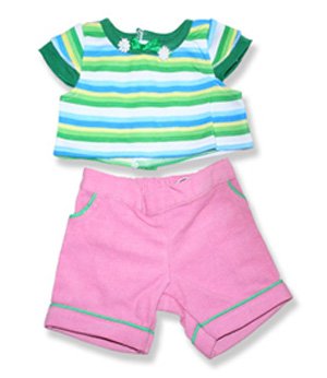 -. Binding : Toy -. Brand : The Bear Mill -. Color : Pink, Green -. EAN : 0611265007743 -. Feature : Green stripe teddy bear top / pink pants with green trim / fits 15 inch plush / 2 piece outfit / top embelished with flowers at neckline -. Label : The Bear Mill -. Manufacturer : The Bear Mill -. Model : 6087 -. MPN : 6087 -. PackageQuantity : 1 -. PartNumber : 6087 -. ProductGroup : Toy -. ProductTypeName : TOYS_AND_GAMES -. Publisher : The Bear Mill -. Studio : The Bear Mill -. Title : Stripe Top and Pink Pants - 6087 Fits 15" - 16" bears, includes Build a Bear, The Bear Mill, and Stuff your own Animals. -. UPC : 611265007743