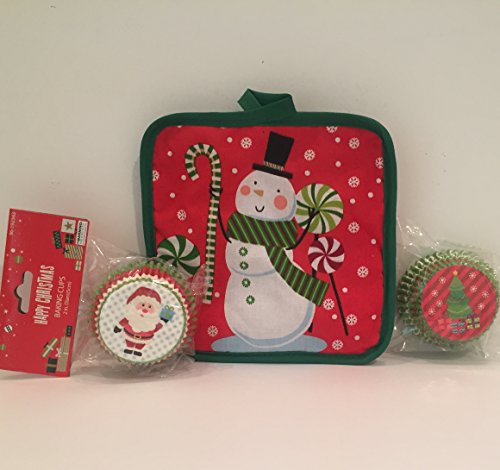 Cupcake Portable Square Carrier /Storage Container With Handle Translucent Dome 2 Christmas Cupcake Papers (50ea)-Designs of Santa and Xmas Tree Plus a Bonus Free Snowman Pot Holder Fun Bundle-4 Items