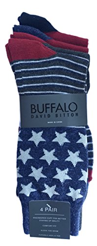 -. Binding : Apparel -. Brand : Buffalo David Bitton -. Color : Multicolor -. Department : mens -. EAN : 0886028041504 -. Feature : Engineered Cuff For Better Staying Up Ability / Comfort Fit / Sleek Toe Seam Durable Heel and Toe / Machine Washable -. IsAdultProduct : 0 -. ProductGroup : Apparel -. ProductTypeName : SOCKSHOSIERY -. Size : 10-13 -. Title : Buffalo David Bitton Men's Four Pair Americana Red White and Blue Stars and Stripes Crew Socks -. UPC : 886028041504