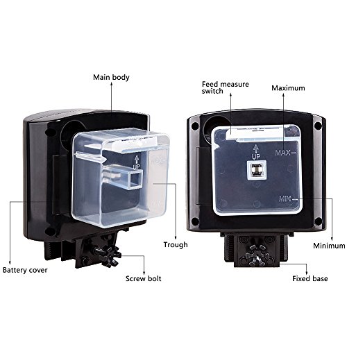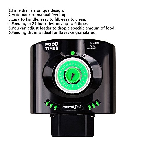It come with the adjustable time dials, when you set up the time dials by adjusting the slider, you may increase or decrease the amount of food dispensed per rotation, then press the manual start time button. Easy to operate and installation, manual and automatic