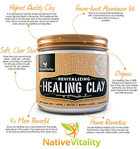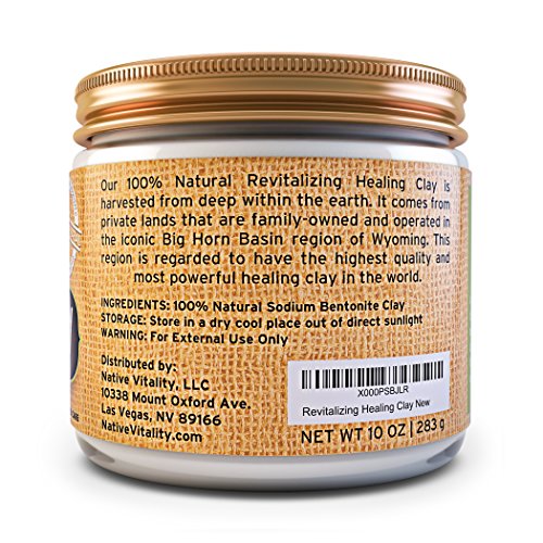 - Feature : ✔︎ SUPER SOFT, CLEAR SKIN: No matter your skin type (Normal, Dry, Oily, Combination or Sensitive) Native Vitality Revitalizing Healing Clay is perfect for all skin types and leaves your skin soft and clear. It treats and fights acne, blackheads and other skin blemishes including liver spots and other signs of aging. / ✔︎ CRAZY EFFECTIVE: Even after just a single use as a mask or another home remedy, you will imminently feel the difference. Super effective hair, skin and body detox. / ✔︎ SUPERIOR QUALITY & PURITY: One of the only 100% pure sodium bentonite clay that is 3rd party tested for its strength and effectiveness. It is harvested on private family-owned land in the iconic Big Horn Basin in Wyoming. This is believed the world over, to be the best area in the world for Healing Clay. Since our lands are private, we do not need to worry about any additives or impurities. We can say with confidence that our clay is by far the best of the best in the world. / ✔︎ MORE THAN FACIAL MASKS: Our Revitalizing Healing Clay goes way BEYOND just clay facial masks. This Aztec secret indian healing clay is great for body wraps, hair, cuts, bug bits, rashes and so much more! / ➤➤➤ FREE HOME REMEDIES eBOOK with your ORDER TODAY! We want you to fully LOVE your Revitalizing Healing Clay and use it everyday, so this Everyday Home Remedies & Masks eBook will be emailed to directly to you after you order.