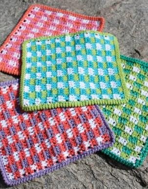 Price is for 6 skeins of Lily Sugar'n Cream. Each bag matched dye lot. Patterns included are Hobo Bag, Mod Gingham Dishcloth, Shopping Tote and Sponge Cozy.