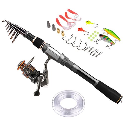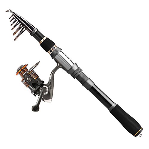 🐟 Perfect elasticity, high density Carbon fiber mixed with fiberglass make your fishing pole hard & durable. Stainless Steel Hooded Reel Seats is anti-seawater corrosion; EVA Fore Grip for comfort. The telescopic fishing rod is portable, and closed length design is convenient carrying around. Power: Medium; Extended Handle.