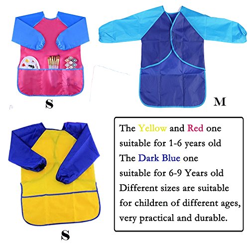PRODUCT SPECIFICATIONS-Material:The art aprons are made of smooth,waterproof polyester material,BPA free,safe and non-toxic.Appliance:It could be used for craft,cooking,eating, gardening or any other messy activity.Suitable For Children Aged 2-9 years;Size: As the image shown;Package included: 3 x Kids Art Smocks(There Colors,Sent In Random)