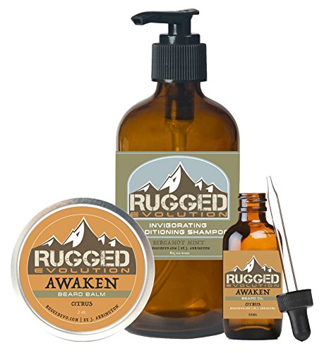 Rugged Evolution [Awaken (Citrus Scented) - Strong Strength] Premium Beard Care Combo Package [Daily Man] - Facial Hair Care Balm, Beard Oil & Shampoo - Great Gift Idea (3 Piece Set)