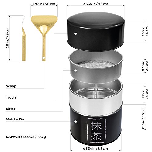 - Built-in sifter, and scoop included - Diameter 82mm X Height 95mm - Capacity up to 113g (4-ounce) of pure matcha - Fine 8mm mesh screen net
