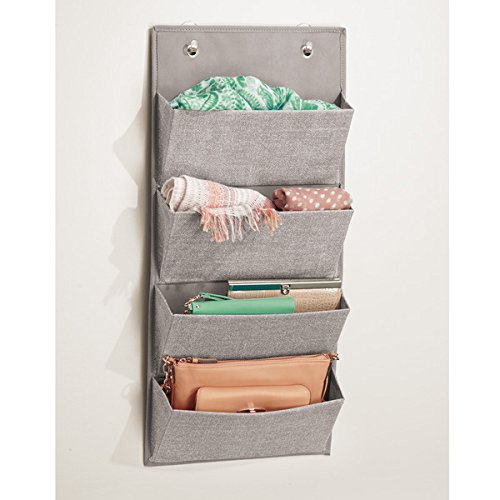 - Fabric over the door or wall mount organizer with 4 pockets conveniently stores clothes, purses and more.