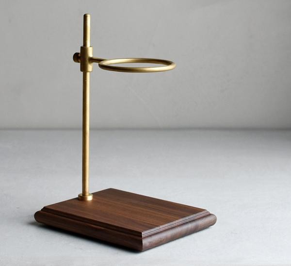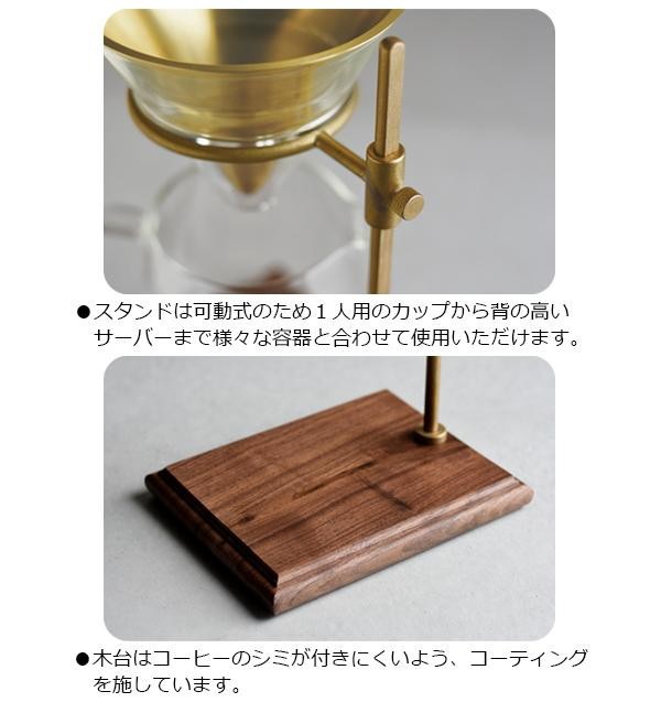 深みのある色調のウォールナットと、経年変化が楽しめる真鍮を組み合わせた重厚感ある佇まいのブリューワースタンドです。木台はコーヒーのシミが付きにくいよう、コーティングを施しています。スタンドは可動式のため1人用のカップから背の高いサーバーまで、様々な容器と合わせてご使用いただけます。 |