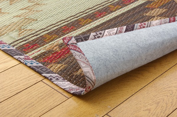 お部屋のちょっとしたスペースにちょうどよい、人気のキリム柄のい草ルームマットです。中材にウレタンフォームを使用しており、適度なクッション性があります。い草には空気の自然浄化作用、湿度の調節作用などがあります。また汚れにくく、使用するうちに黄金色に変化し、味が出ます。ホットカーペットカバーとしても使用できます。い草に青森ヒバ加工を施しています(抗菌、防臭効果)。裏面にはフローリングを傷付けにくい様不織布を貼っています。
