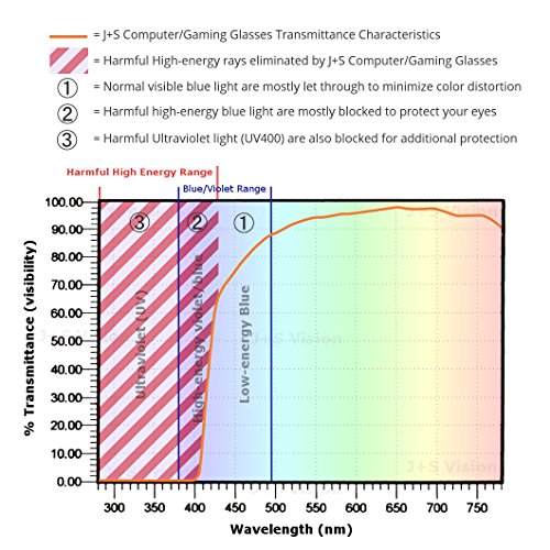 BLOCKS 90% OF HIGH ENERGY BLUE LIGHT - J+S Vision Blue Light Shield protects your eyes by filtering out 90% of High Energy Blue Light rays while letting through the less harmful low energy blue light.