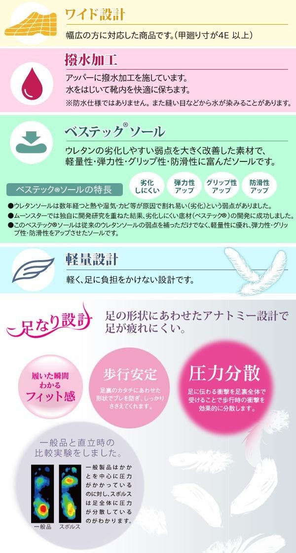 | 仕様 | 足なり設計 撥水加工 足幅ワイド設計(4E) 軽量設計 ヒール高:約3.0cm 製法:ダイレクトソーリング式 |
