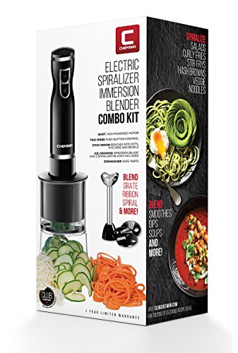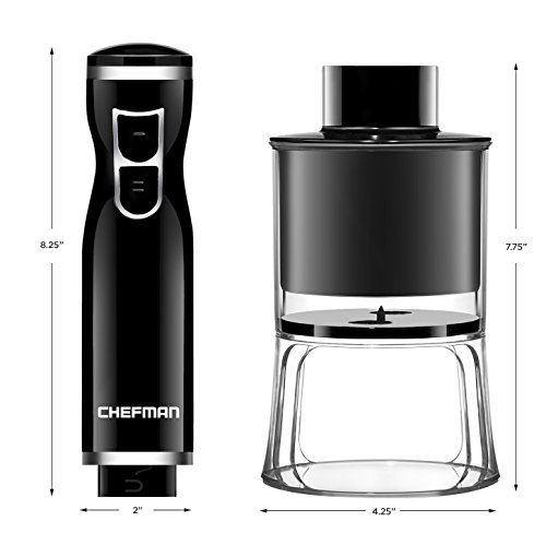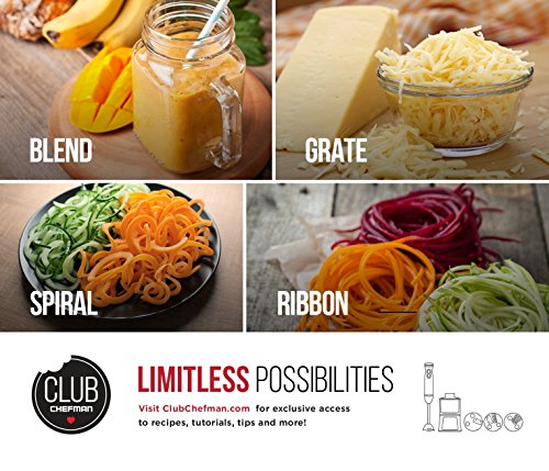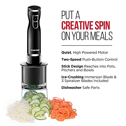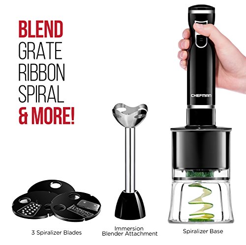 Studio : Chefman Publisher : Chefman Product Description Equipped with a powerful 300 Watt ultra quiet motor, this immersion hand blender quickly purees soups, blends batters, mixes beverages, and more. The unit's unique cross blade provides extremely smooth and even blending, while its protective blade guard helps prevent splattering. This set includes a powerful extension for blending, as well as 3 spiralizing blade attachments for a variety of creative food prep options. Other useful features include a lightweight design, an easy-to-grip ergonomic handle, and simple push-button control. 0