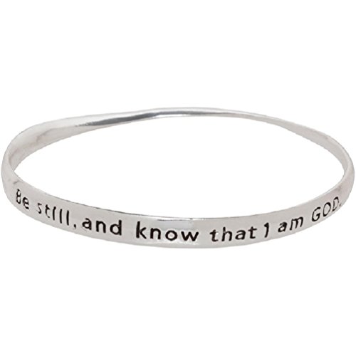 " Be still, and know that I am GOD." The phrase is small but mighty in Psalm 46:10 and written on this beautiful silver tone stack bracelet. The bracelet is perfect for stacking with other bracelets, or powerful enough to stand alone. The bracelet is 8" around and is 1/2" wide.Feature
