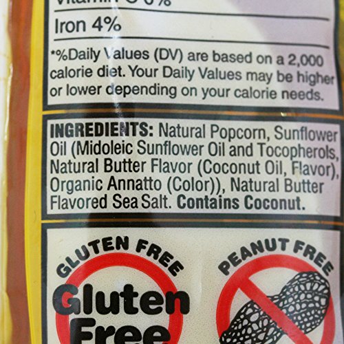 - Ingredients: Natural Popcorn, Sunflower Oil (Midoleic Sunflower Oil and Tocopherols, Natural Butter Flavor (Coconut Oil, Flavor), Organic Annatto (Color),Sea Salt. Contains Coconut.