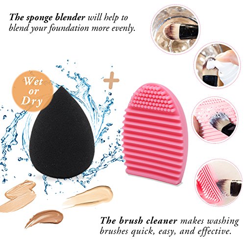 - FULL MAKEUP BRUSH SET WITH FREE SPONGE&CLEANER: A variety of 12pcs makeup brushes meets all your needs for foundation, powder, blush, eyeshadow, concealer, eyeliner, eyebrow. Come with a free sponge blender: Wet the sponge with water, squeeze out excess liquid, and bounce your makeup product across your face for a flawless look. A free Silicone Brush Cleaner: Very useful tool to cleaning various of your makeup brushes so that to avoid some facial problem.