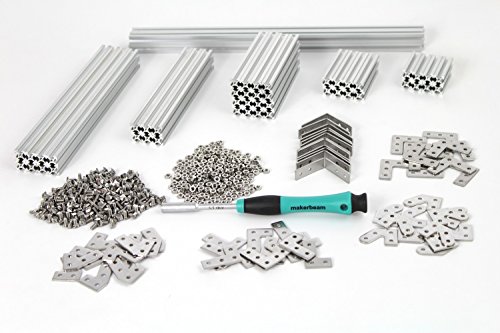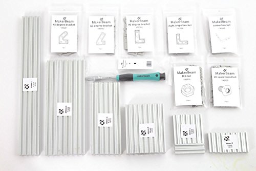 - MakerBeam Starter Kit consisting of 50 Mini T-slot profile beams (4x300mm, 8x200mm, 6x150mm, 16x100mm, 8x60mm, 8x40mm), 60 brackets (24x90°, 12x60°, 12x45°, 12x corner bracket), 250xsquare headed bolts (M3), 250xnuts (M3) and 1 hex nut driver; additional elements can be ordered individually