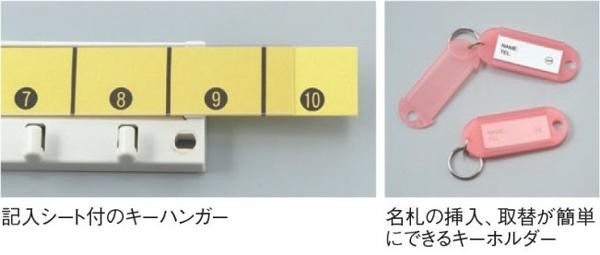 | 鍵の集約管理で高効率な作業環境を実現!!携帯、壁掛け兼用で、手提げ用ハンドル付。付属のキーホルダーは全面が開くので名札の挿入、取替が簡単!!キーハンガーは色分けされた番号入りのシート付で、分かりやすく分類できる!! |