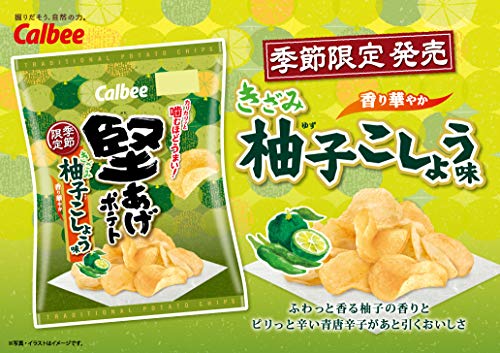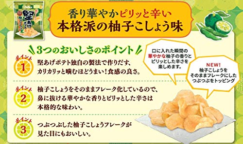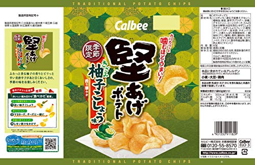 原材料:じゃがいも(遺伝子組換えでない)、植物油、食塩、唐辛子パウダー、砂糖、デキストリン、コーンスターチ、たん白加水分解物(大豆を含む)、ゆずこしょうパウダー、ゆずこしょうフレーク、酵母エキスパウダー、粉末酢、チキンパウダー、小麦たんぱく発酵調味料/調味料(アミノ酸等)、香料、酸味料、甘味料(ステビア)、着色料(紅花黄、カロチノイド、クチナシ)、香辛料抽出物、酸化防止剤(ビタミンC)