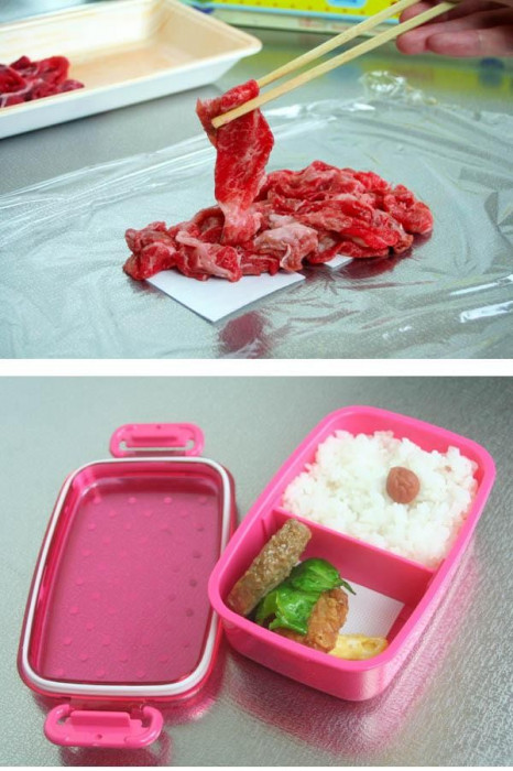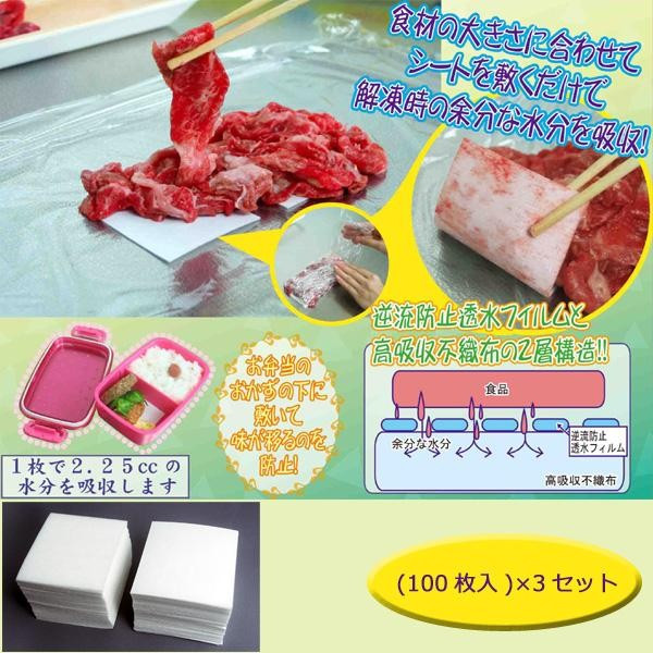 | 冷凍小分け時に食材の下に敷いて置くだけで、お肉から出る血液や解凍時の余分な水分を吸収します。逆流防止透水フィルムと高吸収不織布の2層シートなので、吸った水分が食品に戻りません。また、お弁当のおかずの下に敷いて置くと、汁気を吸って他のおかずやご飯に味が移るのを防ぎます。 |
