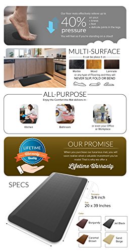LIFETIME WARRANTY: Easily the best comfort mat one can buy, at an affordable price, we have also gone the extra mile and made a statement to stand behind our mat. Not only are you covered under a 30-Day 100% Satisfaction or Money Back Guarantee, but you are also entitled to a full Lifetime Warranty. Try our mat risk free now and you will soon realize what a valuable investment you've made!