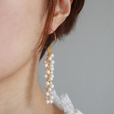 얇은 링 아래 몽글몽글 자리잡은 작은 진주들이마치 포도송이 같은 귀걸이에요.보통 진주 하면 떠오르는 격식있고, 어른스러운그런 느낌이 아닌 좀 더 가볍게진주를 즐기기 좋은 아이템 이랍니다.걷거나 움직일 때면 길게 드롭된 진주들이무겁지 않은 느낌으로 찰랑이는데요게 기분이 참 좋아요. * 전체 신주 소재로 알러지에 민감하신 분들은 신중한 구매 부탁드립니다.