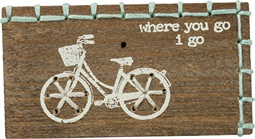 - Unique design features wood block decorated with blue/green stitches, painted bicycle and sentiment