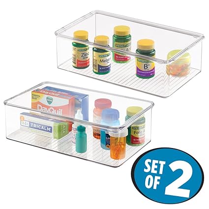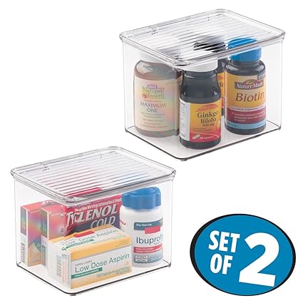 - Stores vitamins, medications, health supplies and supplements, and various pill bottles and containers