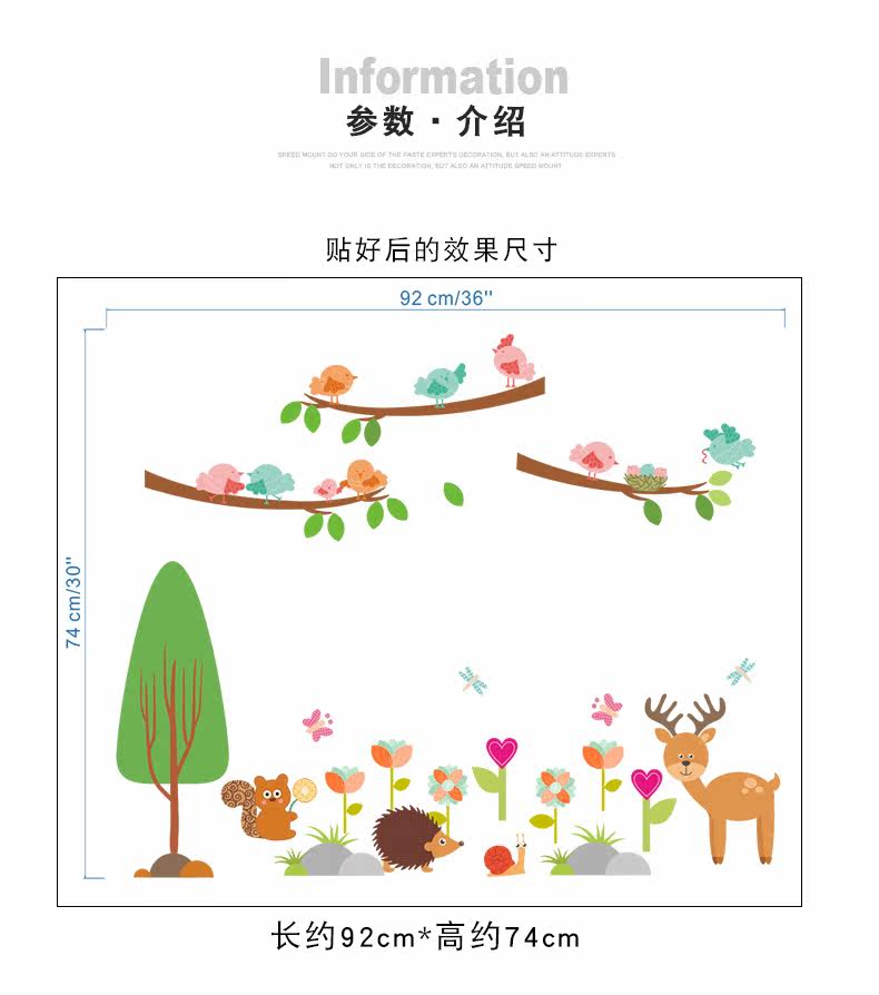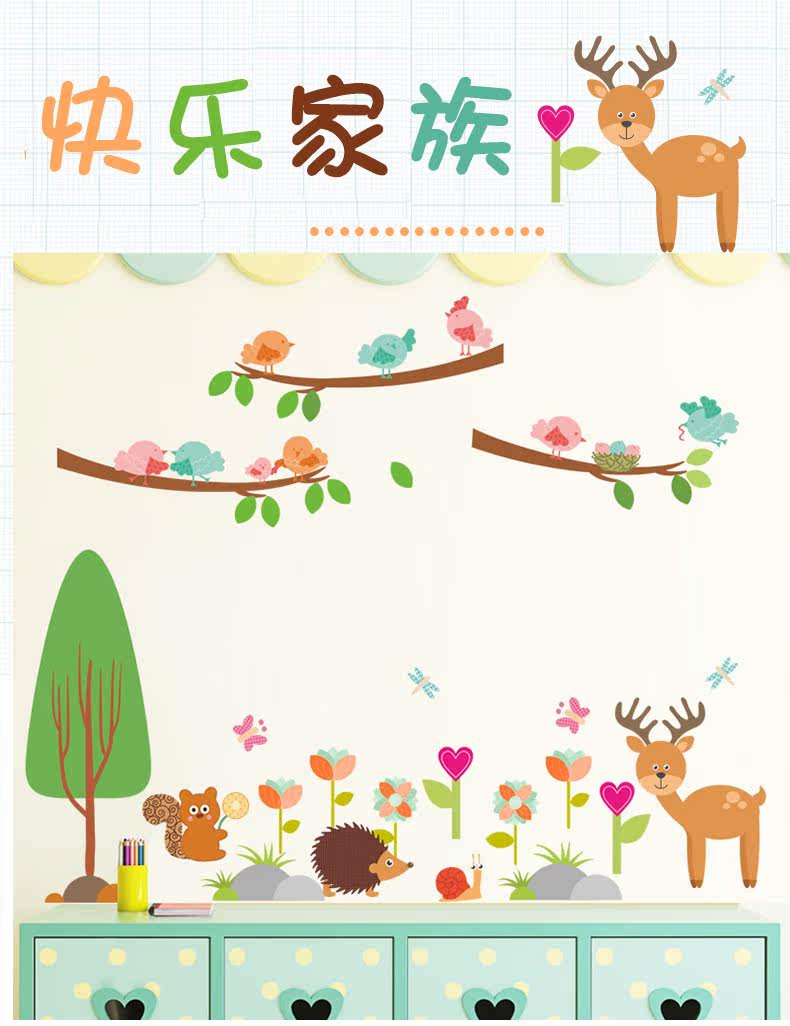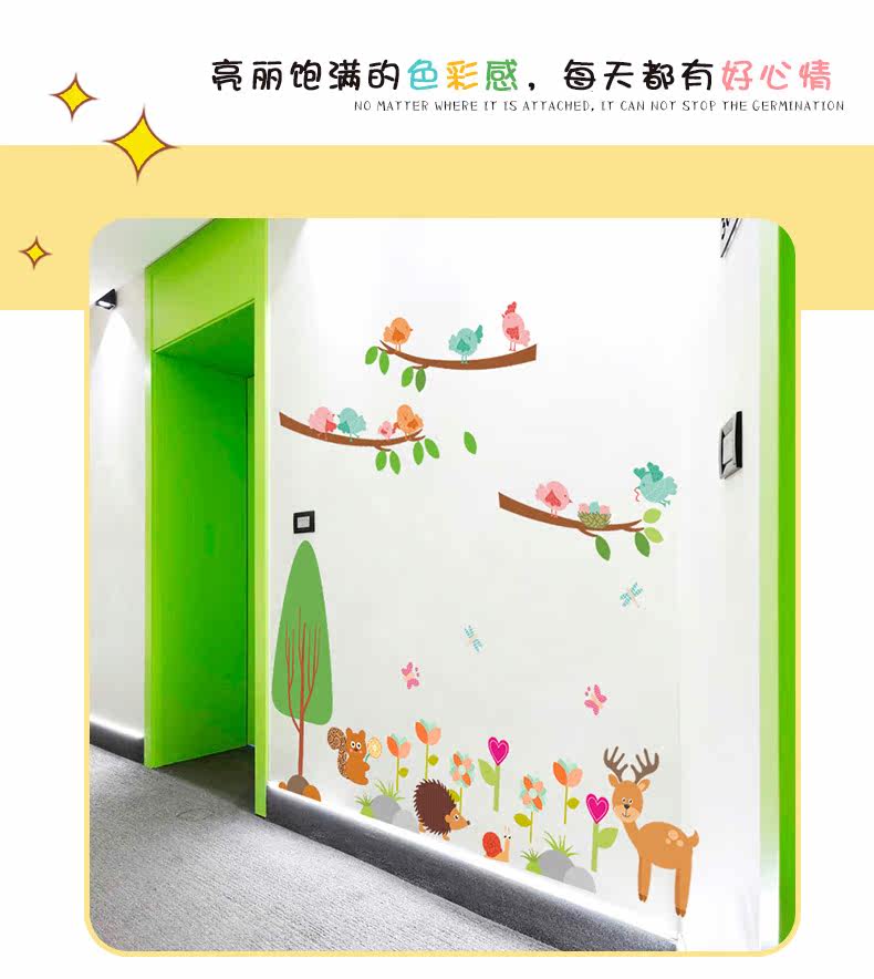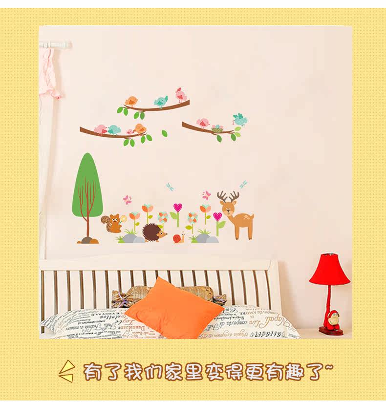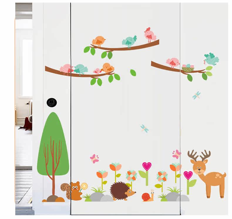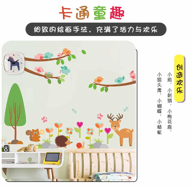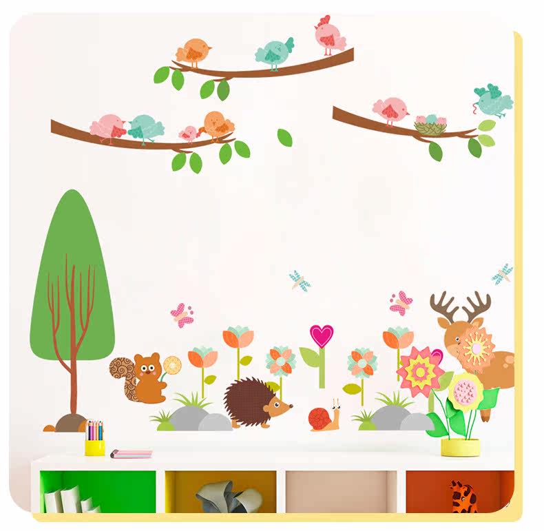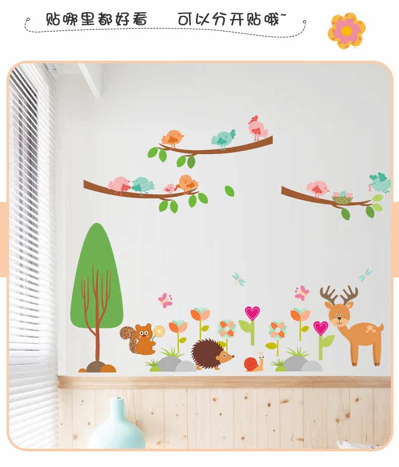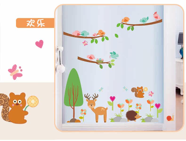 儿童卧室松鼠小鸟卡通动物幼儿园可爱创意墙面装饰可移除墙贴贴画