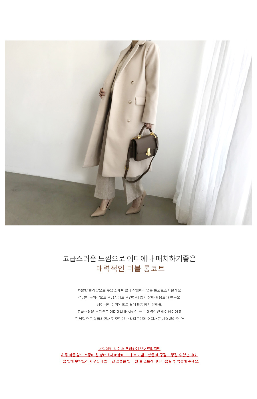 배송 받으실 때까지 예쁜 핏 그대로 받아 보실 수 있도록 카라 부분을 실로 고정하거나 주머니를 막아 놓은 부분이 있습니다.