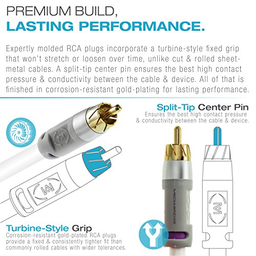 A split-tip center pin ensures high contact pressure and signal strength, while unique gripped molding and corrosion-resistant gold-plated RCA connectors provide a consistently tighter fit than commonly rolled cables with wider tolerances.