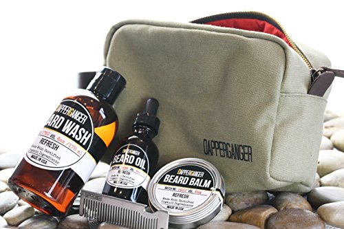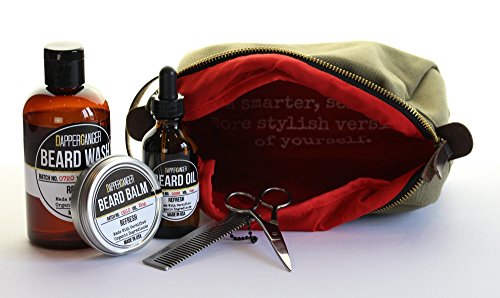 BEARD KIT SET BEST FOR FATHERS DAY GROOMING & MADE CERTIFIED ORGANIC FULL SIZED BOTTLES VERSUS MOST WHO OFFER SAMPLE TEST SIZE VOLUMES. 2 Full Ounces of Beard Oil, 2 Full Ounces of Beard Balm, 8 Ounce Beard Wash. This Complete Beard Gift Pack for men includes Metal Comb Keychain Bottle Opener +Stainless Steel Beard Trimmer Scissors + Canvas Men Dopp Toiletry Bag.