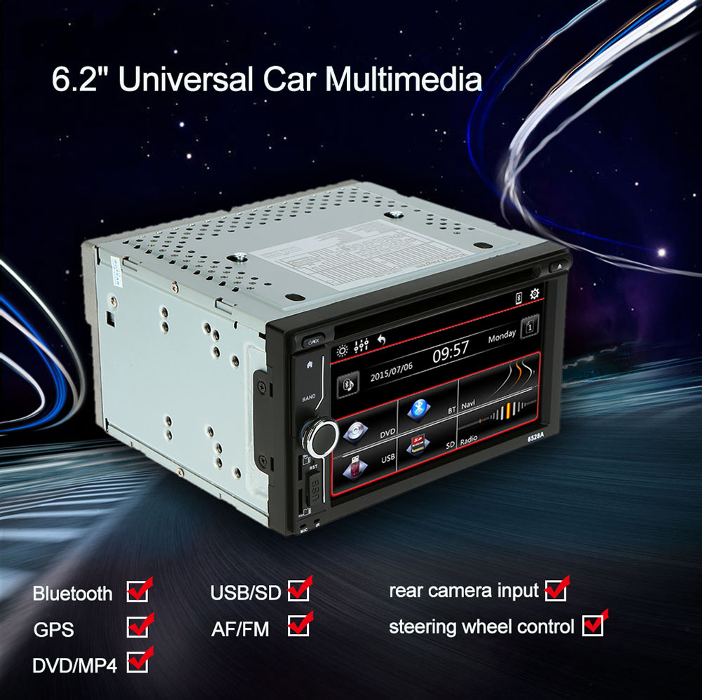 With 6.2 inch touch display and beautiful UI design? support DVD/MP4?USB/SD?AF/FM? Bluetooth? GPS Navigation? steering wheel control? rear camera input? this multimedia player is the best device for your car entertaiment.