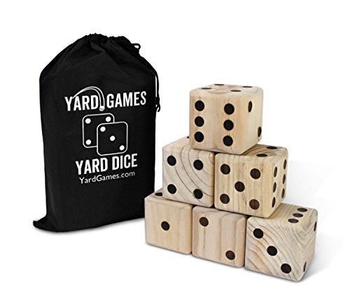 Giant Wooden Yard Dice includes six (6) beautifully crafted oversized dice! Take your favorite dice games outdoors or play on the floor. Game comes with drawstring bag for easy storage and transport.