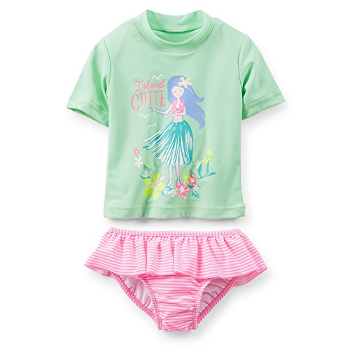Featuring a ruffle, stripes and tropical hibiscus flowers, this cute set will have her hula dancing in no time.