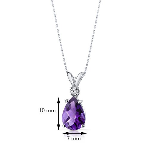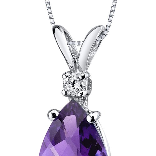 Gemstone: Genuine Amethyst, Pear Cut, 10 x 7 mm, 1.58 carats, Royal Purple Hue with Brilliant Sparkle. 0.05 carat genuine Diamond with G-H color and SI1-SI2 clarity. Pendant: 0.8 grams pure 14k White Gold with 14k stamp. Pendant feature exceptional Design, Craftsmanship and finishing. Perfect gift for Mothers Day, Birthdays, Valentines Day, Graduation, Christmas or just about any other occasion. Money Back Guarantee. Includes a Signature Gift Box. Includes matching 18 inch Sterling Silver Rhodium Finish Box Style Chain. Style P8942Feature