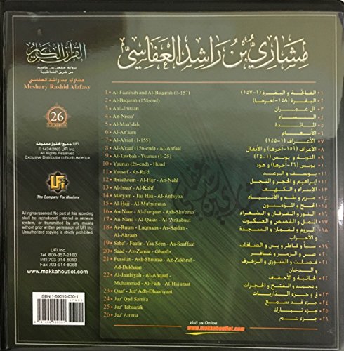 -. Author : Meshary Rashid Alafasy -. Binding : Audio CD -. Brand : Veluxio Naturals -. Color : Color12 -. EAN : 9781590100301 -. Feature : We don't know when or if this item will be back in stock. -. ISBN : 1590100301 -. Label : UFI, Inc. -. Manufacturer : UFI, Inc. -. ProductGroup : Book -. ProductTypeName : BOOKS_1973_AND_LATER -. PublicationDate : 2009-01-01 -. Publisher : UFI, Inc. -. Studio : UFI, Inc. -. Title : The Complete Tarteel Recitation of the Qur'an (26 CDs) by Meshary Rashid Alafasy