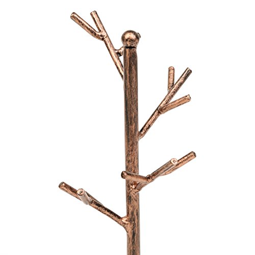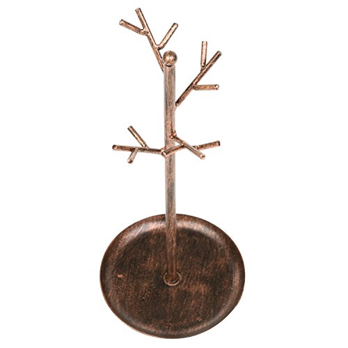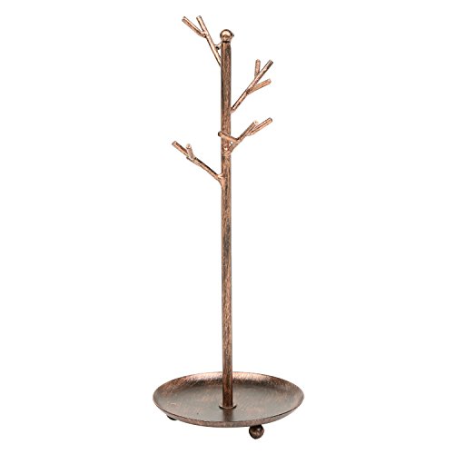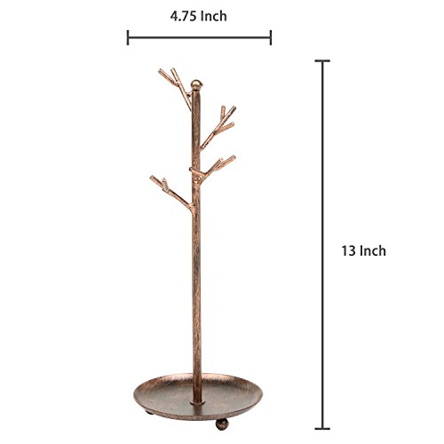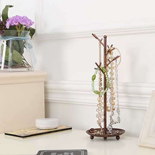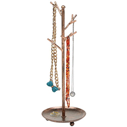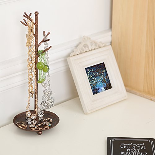 MyGift Jewelry Tree Organizer, 10 Hooks Necklace Rack Stand w/ Ring Dish Tray, Brass
