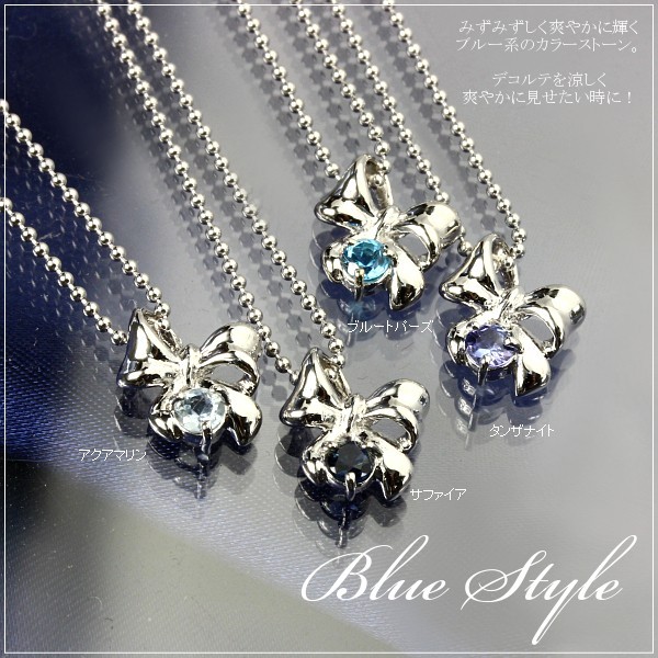■シルバー リボン誕生石ネックレス 11月 ブルートパーズ