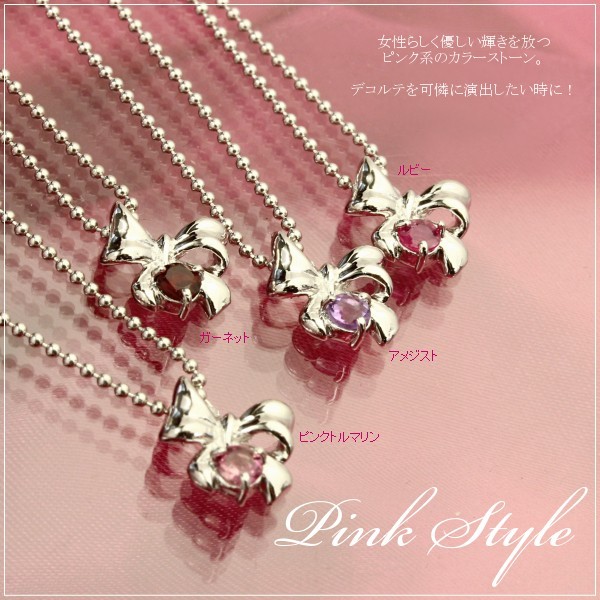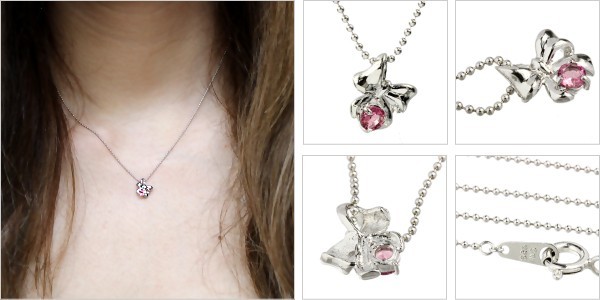 ■シルバー リボン誕生石ネックレス 10月 ピンクトルマリン
