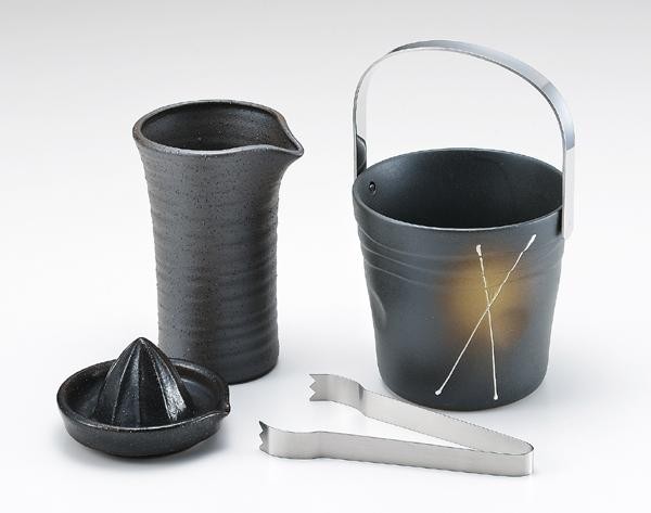 高級美濃焼のアイスペール・ウォーターピッチャー・レモン絞り、ステンレスアイストングのセットです。土のぬくもりに触れ、穏やかな時間を。 |