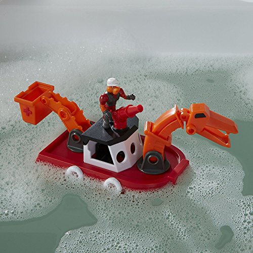 Fire boat with spout; segmented, movable tail; opening jaws and cab roof; tilting head; sliding neck; rolling wheels; and Dino-man action figure.