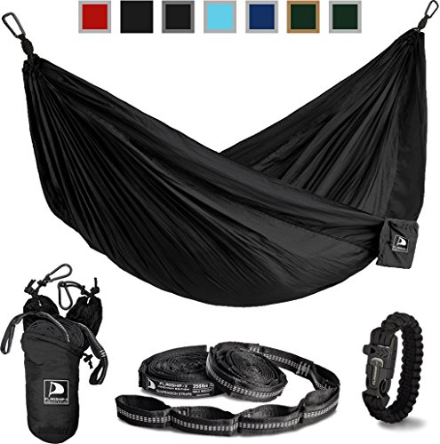 WEATHER RESISTANT Parachute Nylon material for durability. Fits 2 adults (118 x 79in) and comes with two 9ft tree straps with 16 loops each and bonus survival paracord bracelet with fire starter.