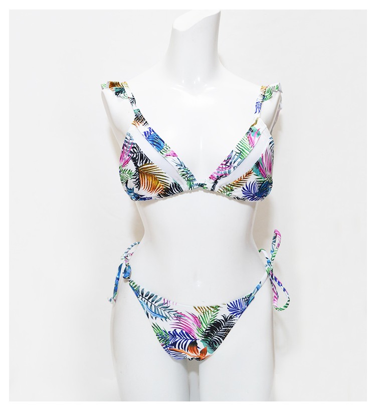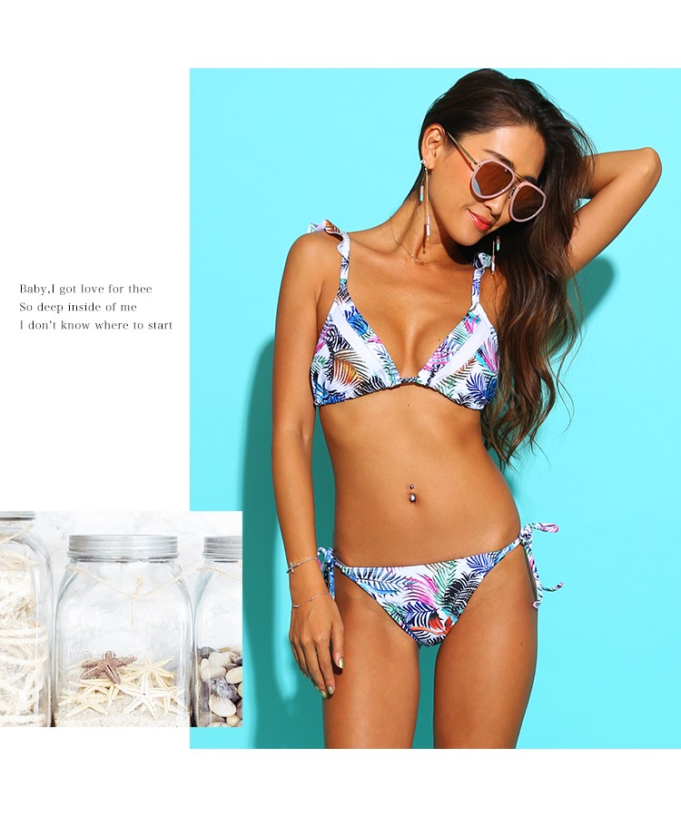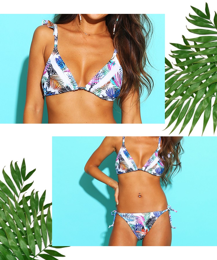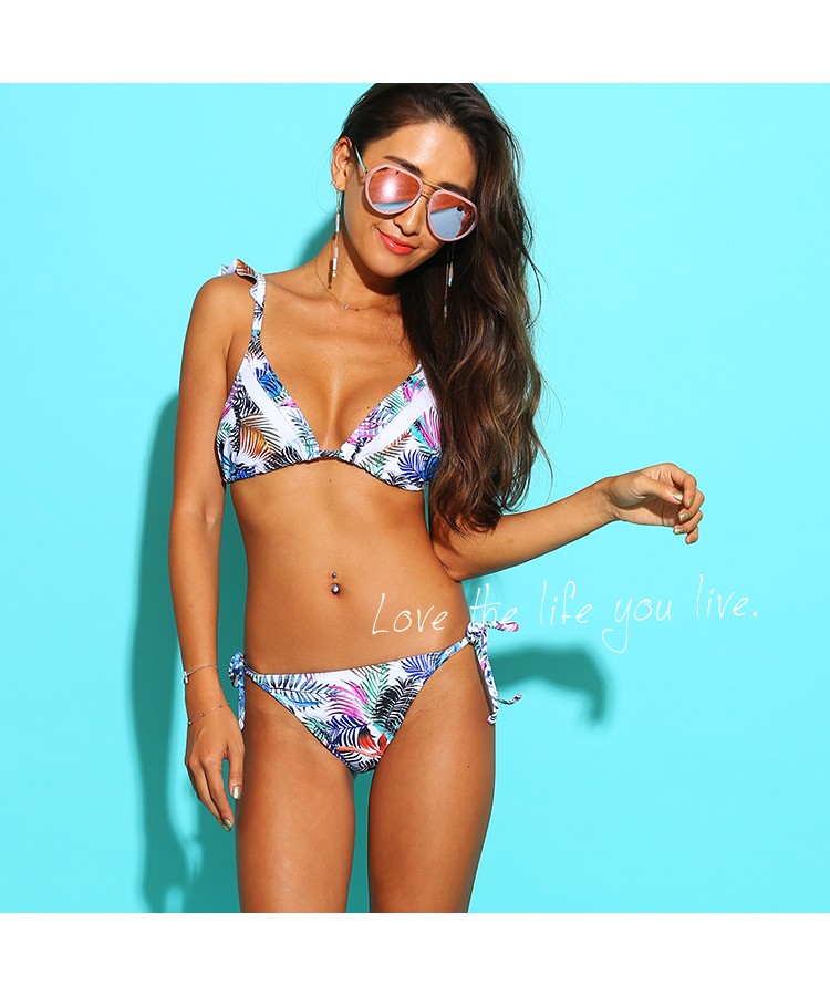 | 商品特徴 | LAVIA(ラヴィア)から新作のプチプラ水着が入荷しました。定番人気の三角ビキニからカラフルなリーフ柄が登場!ノンワイヤーで付け心地ソフト!華著なデザインが女性らしい魅力をぐっと高めてくれます。トップスにはフリルも施されレディな印象に。女性らしいボディに見せてくれる三角シルエットに目を惹く白地にカラフルなリーフ柄は焼けた肌にぴったりです!パット、パットポケット付き。 |