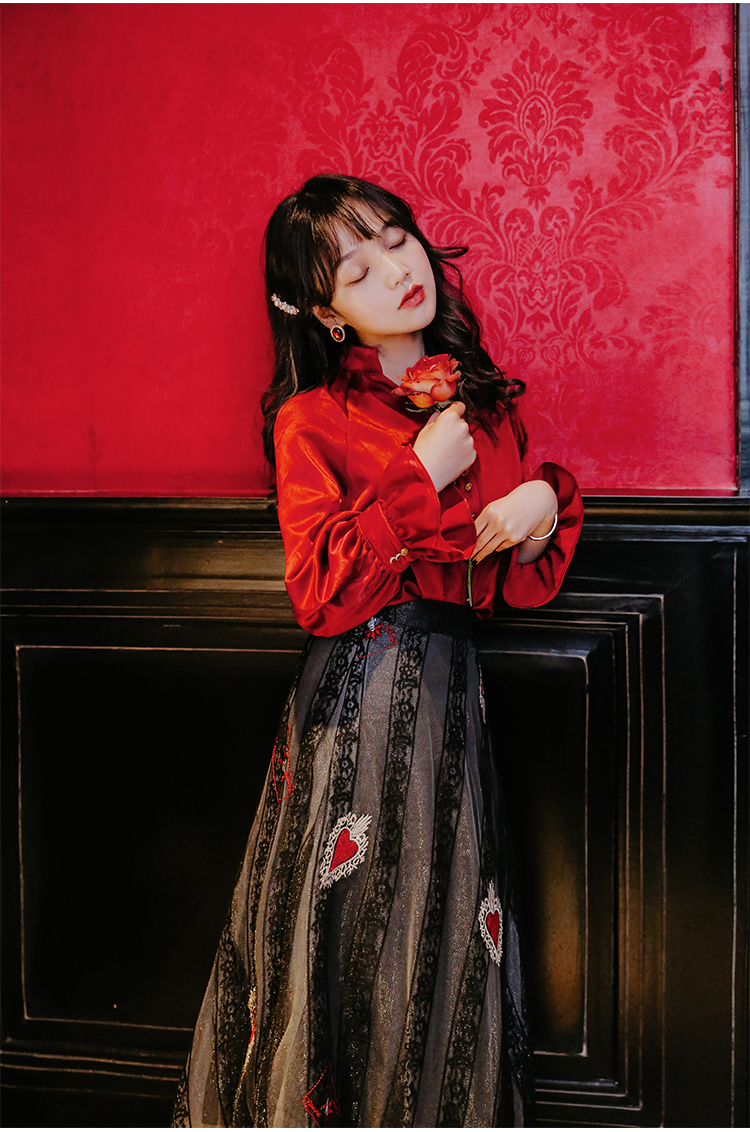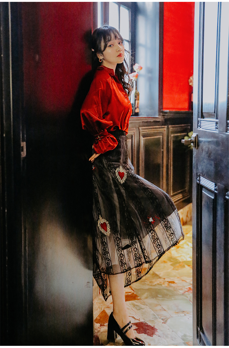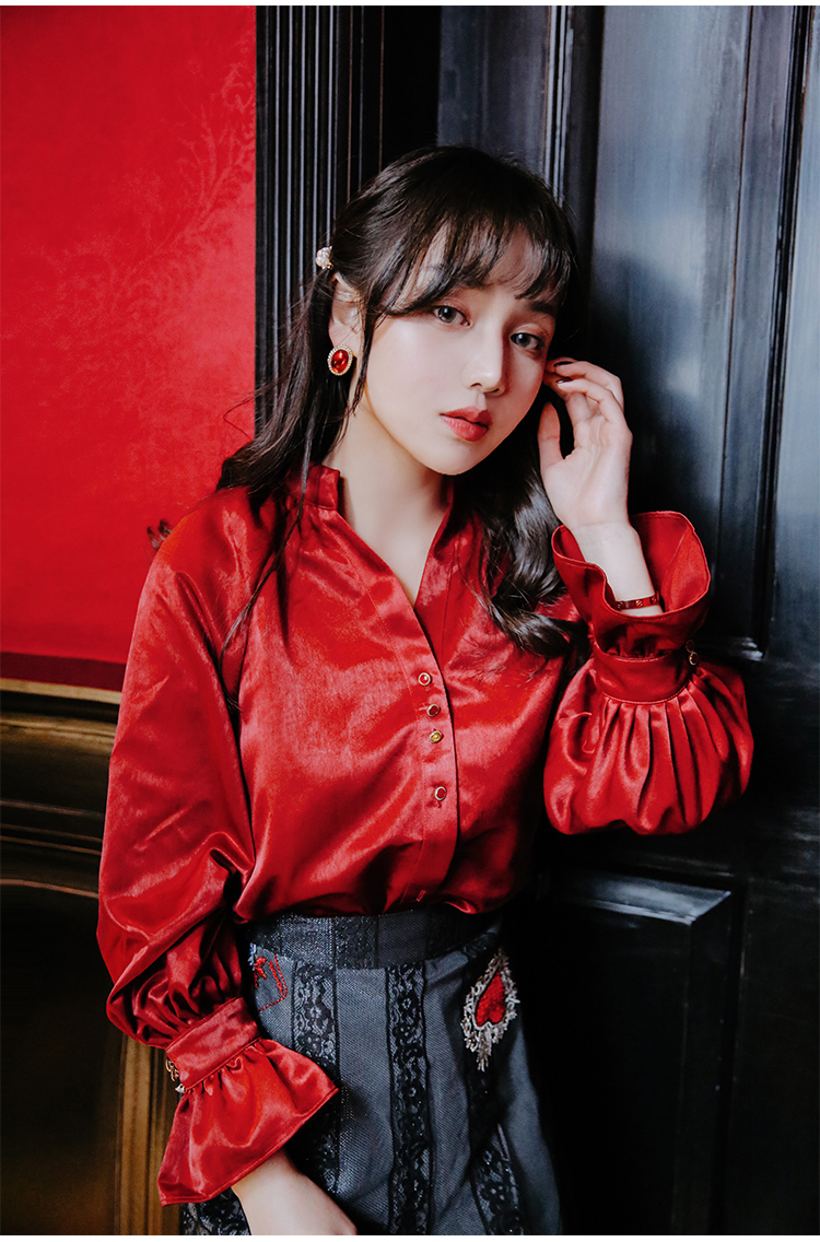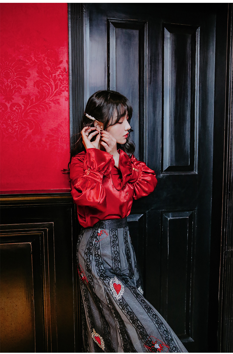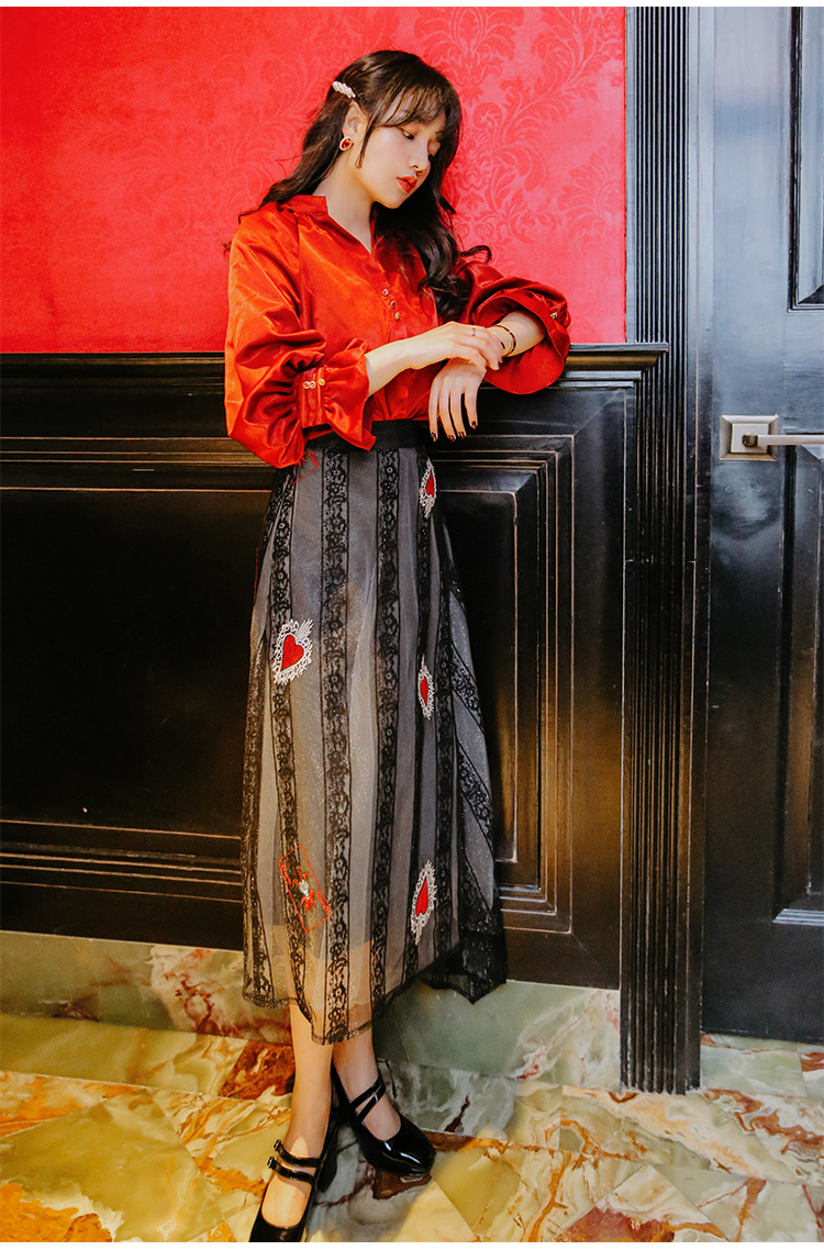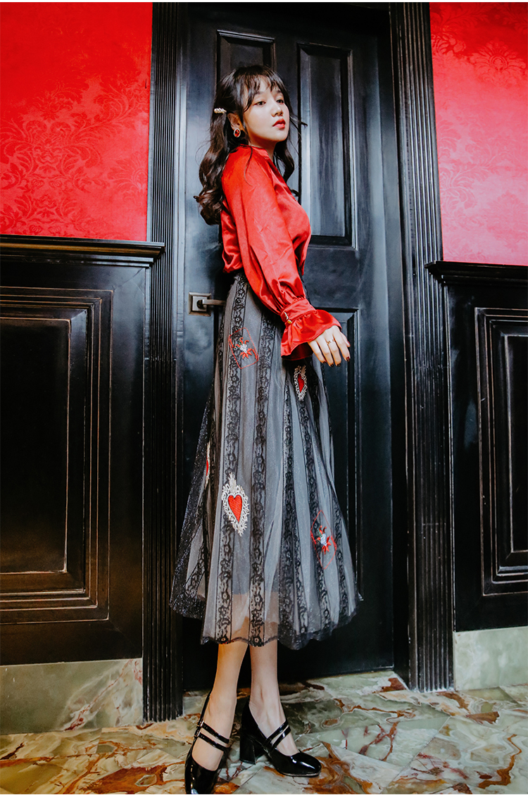 光沢のあるビンテージレッドのブラウス&ハート柄刺繍が施されたレーススカートのセットアップです。