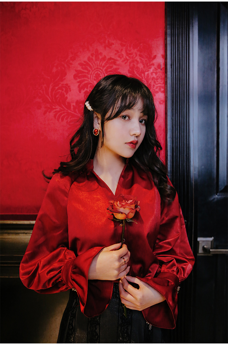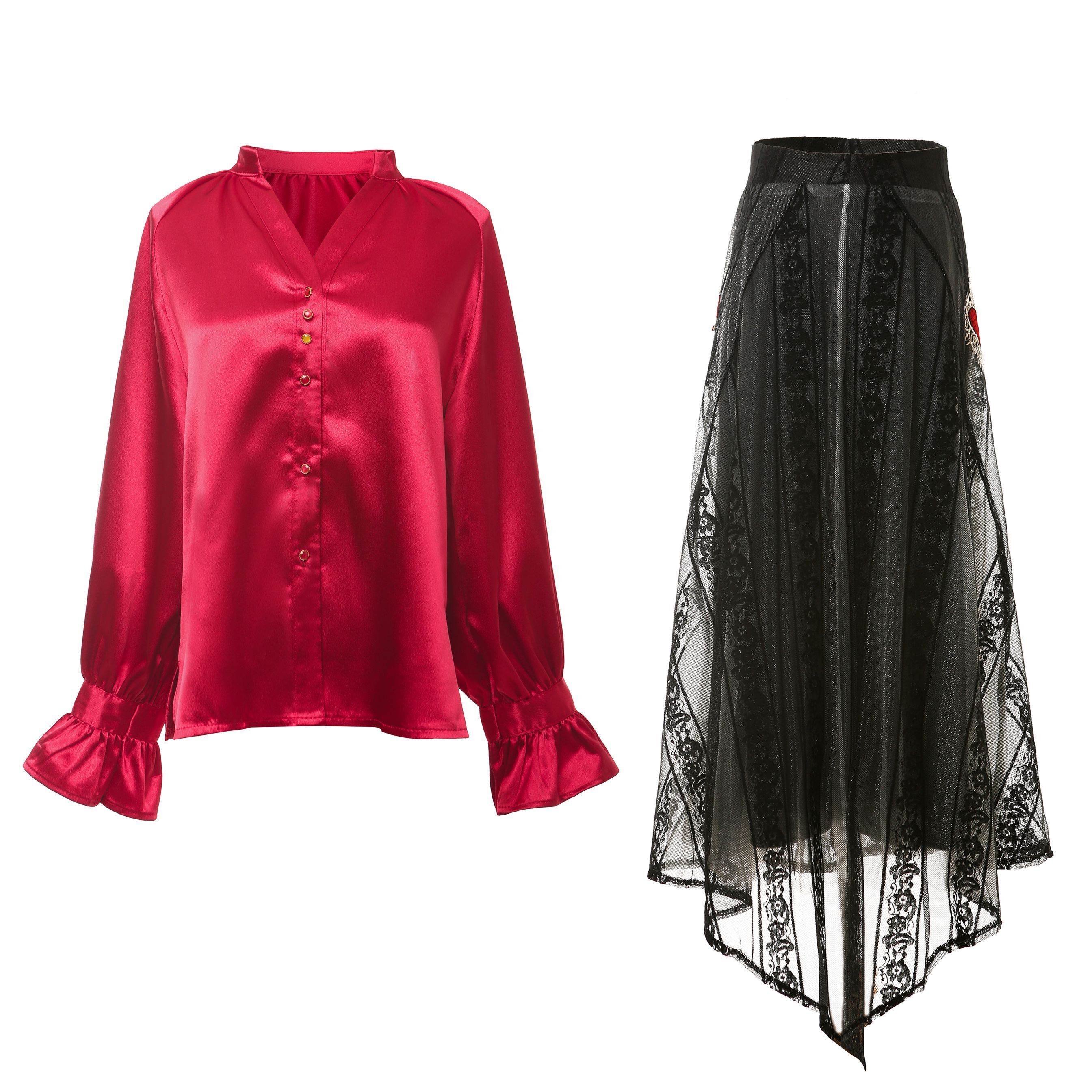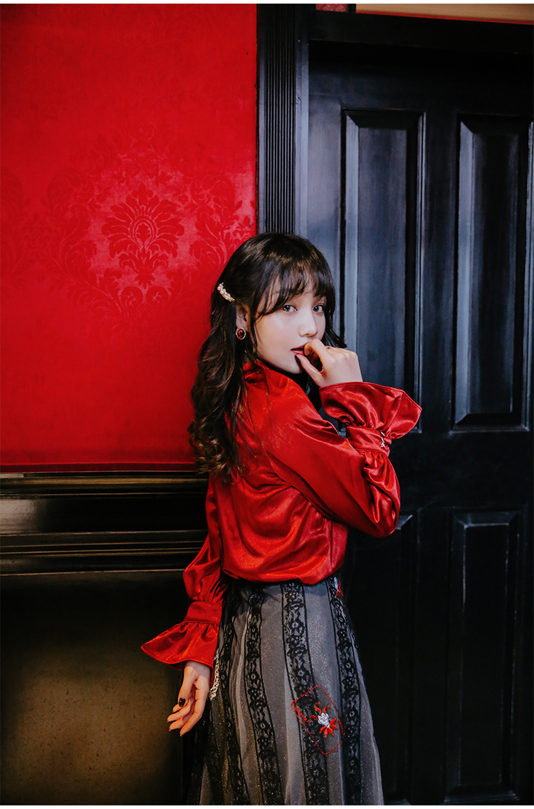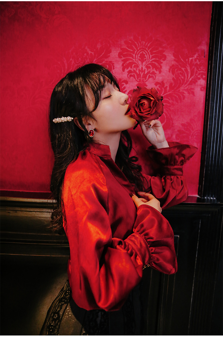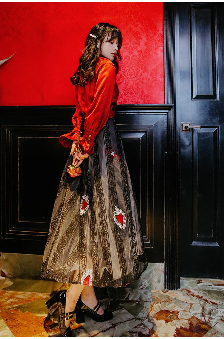 光沢のあるビンテージレッドのブラウス&ハート柄刺繍が施されたレーススカートのセットアップです。
